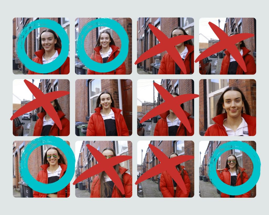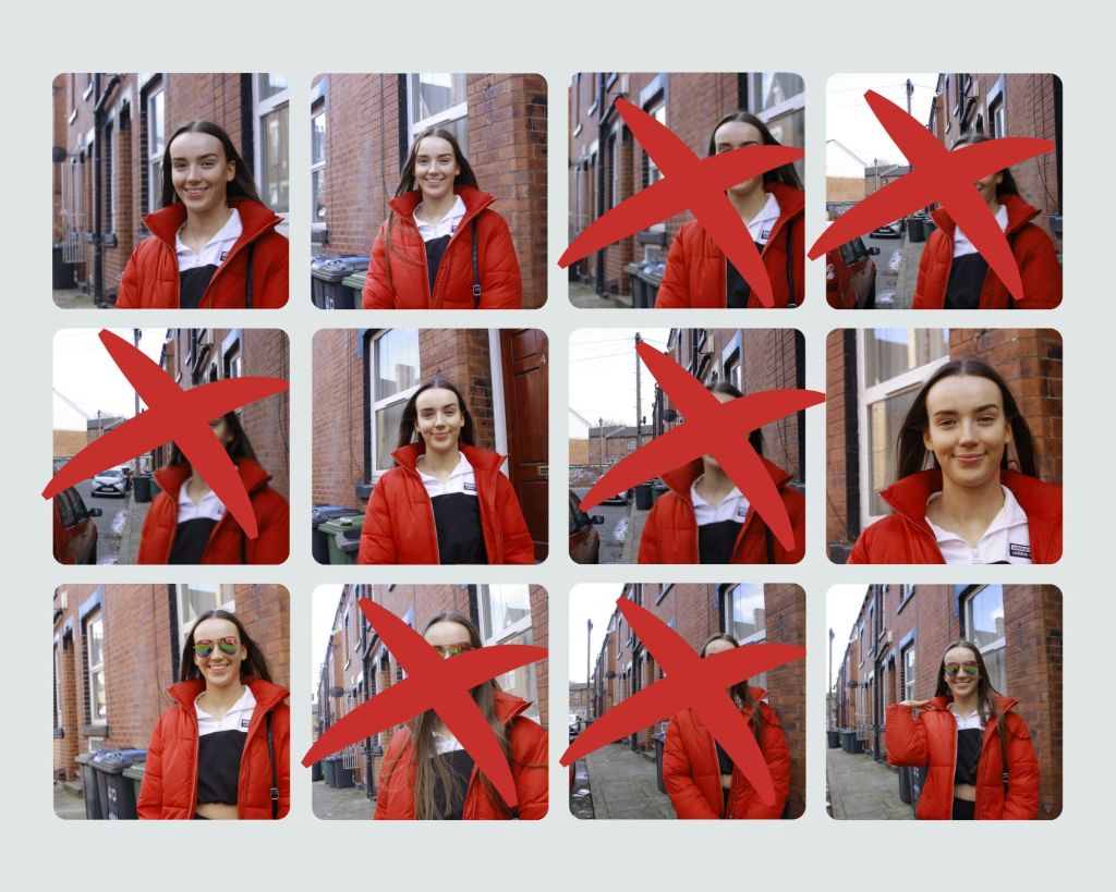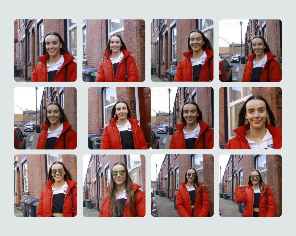 I then took the Images into photoshop and light and colour corrected them using adjustment layers. I wanted to make the images appear brighter and more colourful to capture her personality and a love for Leeds, I think I could have gone further with the colour correction but as I was knew to this I didn’t want to go overboard with adjustments. I also cropped the image to focus on Erin and not the bins in the background. Finally I resized the image to 1024 pixels wide before exporting.